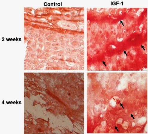 Fig. 4 IGF-1 promoted odontogenic differentiation of hDPCs in vivo. Alizarin red staining was performed to identify calcium-containing odontoblast, showing more mineralized tissues (arrows) in IGF-1 group compared to the control group (without IGF-1) at 2 and 4 weeks post-transplantation.
