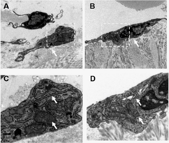 Fig 5 TEM analysis. A-B: The subcellular structure of hDPCs in scaffold 2 weeks (A) and 4 weeks (B) post-transplantation in IGF-1 group (magnification × 6K). C-D: The subcellular structure of hDPCs in scaffold 2 weeks (C) and 4 weeks (D) post-transplantation in IGF-1 group (magnification × 15K). Mitochondria and rough endoplasmic reticulum were highlighted using arrows.
