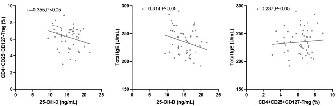 The results of Pearson correlation analysis revealed negative correlations of the expression level of serum 25-OH-D with the expression levels of CD4+CD25+CD127- Tregs and total IgE (r=-0.355, -0.314, p<0.05) and a positive correlation between expression levels of CD4+CD25+CD127- Tregs and total IgE (r=0.233, p<0.05) (Fig. 1).