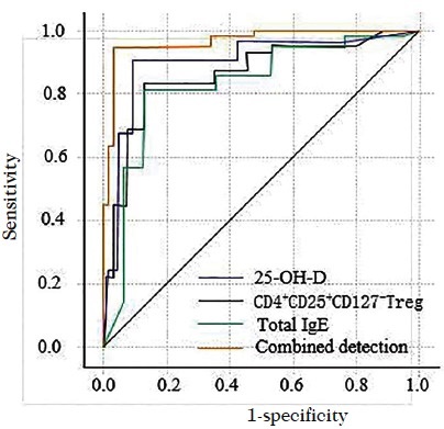 The AUC value of combination of 25-OH-D, CD4+CD25+CD127- Tregs and total IgE for predicting the incidence of RRTIs was 0.852, which was significantly larger than that of any of the three indicators alone (0.752, 0.654 and 0.643, respectively; p<0.05) (Fig. 2).