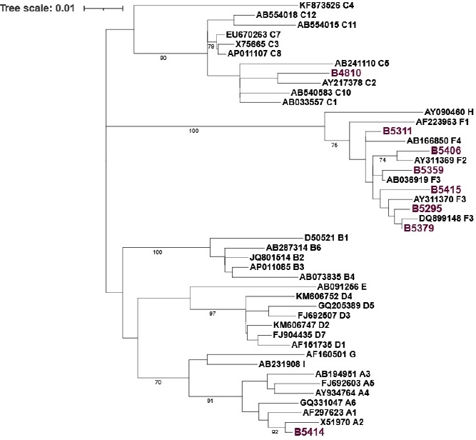 Fig. 1 Phylogenetic tree of the HBV isolates tested in this study. The S gene is analyzed (559 nt). The evolutionary history was inferred using the Maximum Likelihood method and the General Time Reversible model14. The tree with the highest log likelihood (-2602.78) is shown. The percentage of trees in which the associated taxa clustered is shown next to the branches. Initial tree(s) for the heuristic search were obtained by applying the Neighbor-Joining method to a matrix of pairwise distances estimated using the Maximum Composite Likelihood (MCL) approach. A discrete Gamma distribution was used to model evolutionary rate differences among sites (4 categories (+G, parameter = 0.6597)). The rate variation model allowed some sites to be evolutionarily invariable ([+I], 62.58% sites). The tree is drawn to scale, with branch lengths measured in the number of substitutions per site. This analysis involved 45 nucleotide sequences. Codon positions included were 1st+2nd+3rd+Noncoding. All positions with less than 80% site coverage were eliminated, i.e., fewer than 20% alignment gaps, missing data, and ambiguous bases were allowed at any position (partial deletion option). Bootstrap values are shown in the branches of the tree. The isolates are named by their genotype and GenBank accession number, except for the ones from this study (n=8), which are shown in purple. An additional HBV isolate (B02023) was not included in the tree since the shorter sequence could also be classified as genotype F3.