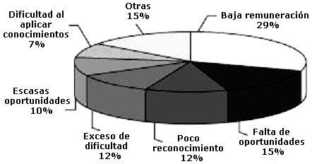 El 93.6% han alcanzado sus expectativas total o parcialmente, y tienen aceptación excelente o buena 85.7%; aunque un porcentaje de ellos no escapa de la situación económica del país y manifiestan que lo que les afecta en el ejercicio profesional es la baja remuneración económica 29.7%; mientras que en el estudio realizado en egresados de la Escuela en el período 1950-1980 se reporta que un 58.4% de ellos señalan que es el poco reconocimiento profesional(15). Sin embargo, el 47.6% han recibido reconocimiento institucional en su ejercicio profesional, lo que indica que tienen buen desempeño laboral, ello puede deberse a que han realizado estudios de postgrado y/o cursos de ampliación de conocimientos; además de utilizar como herramienta de trabajo el computador, lo que evidencia que se han logrado adaptar a las exigencias del medio, combinando esto con el hecho de que la formación académico recibida en sus estudios de pregrado cubrió sus expectativas total o medianamente.