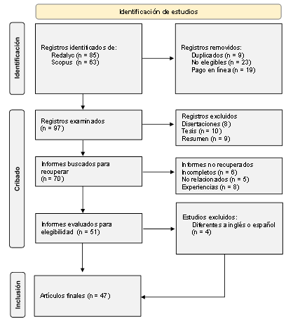 En la revisión de la literatura se utiliza el método PRISMA para seleccionar y filtrar los artículos. Se identificaro 148 documentos en las bases de datos Scopus y Redalyc. Se removieron 9 artículos duplicados, 23 artículos no elegibles por ser escritos en idiomas diferentes al inglés o español, o no relacionados al tema de metodologías activas; luego se removieron 19 artículos por ser de pago en línea. Quedaron 97 artículos. Adicionalmente, se excluyeron otros 8 por ser disertaciones, 10 por ser tesis y 9 documentos por ser artículos tipo resumen. De los 70 artículos restantes, 6 resultaron ser documentos incompletos, 5 no relacionados al tema, y 8 tratan sobre experiencias en uso de metodologías activas, adicionalmente se excluyeron 4 artículos escritos en idioma portugués quedando 47 artículos científicos para analizar a profundidad. Ver gráfico 1.