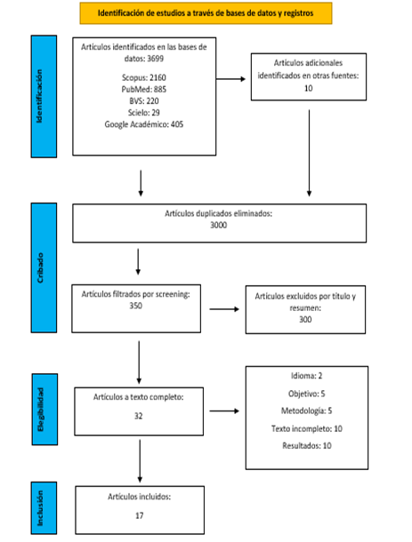 Posteriormente se delimitó el conjunto de artículos encontrados siguiendo el modelo PRISMA, inicialmente, se identificaron 3699 artículos en las bases de datos antes mencionadas y 10 a partir de otras fuentes; después de eliminar duplicados, se mantuvieron 699 artículos. En la fase de cribado, se excluyeron 650 registros tras la revisión del título y resumen, resultando en 49 registros que avanzaron a la siguiente etapa. En la fase de elegibilidad, se revisaron esos artículos en texto completo, y se excluyeron 32 tras esta revisión, lo que dejó un total de 17 artículos elegibles para inclusión.