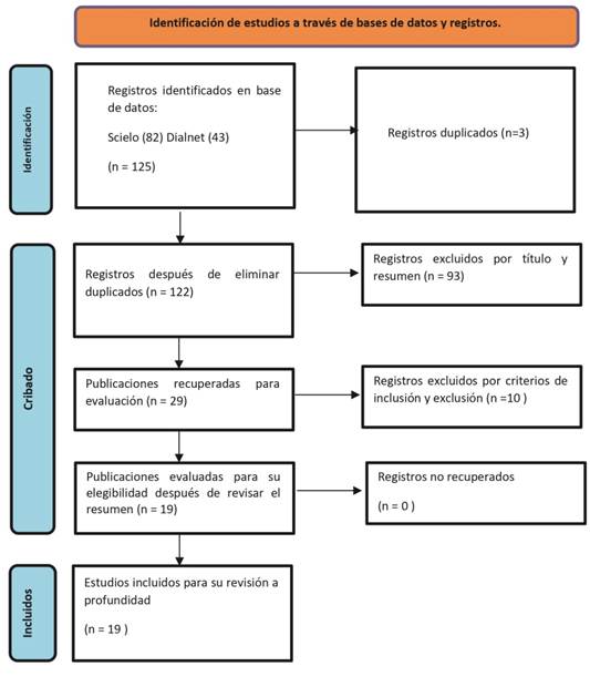 En total, se identificaron 125 publicaciones, en Scielo (82) y Dialnet (43). A continuación, se agruparon todos los resultados y se eliminaron los duplicados (3), quedando 122 publicaciones. Se definieron los criterios de inclusión y exclusión de las publicaciones para cribar los resultados. En relación a los criterios de selección, para la siguiente investigación se incluyeron: a) artículos publicados desde el 2018 hasta el 2024, c) investigaciones cuantitativas o cualitativas. Los criterios de exclusión fueron: a) cartas al editor, capítulos de libro, actas de congreso, revisiones de literatura, narrativas, sistemáticas con y sin metaanálisis, b) La publicación no está relacionada con la temática investigada. c) La publicación no pone el foco en la gestión pública sino en la gestión privada. d) La publicación no realiza una nueva contribución, sino que es una revisión sistemática. e) No hay acceso a la publicación completa.