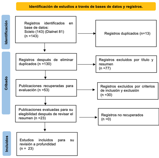 El proceso de selección se desarrolló cuidadosamente en diversas etapas, buscando garantizar la pertinencia, calidad y coherencia de los estudios incluidos. Inicialmente, se realizó una búsqueda dirigida para el análisis de los resultados y discusión en SciELO y Dialnet, seleccionando artículos que respondieran al eje central de la investigación mediante una combinación de palabras clave relacionadas al tema analizado. La revisión de títulos y resúmenes permitió una primera depuración. Posteriormente, se revisaron los textos completos para asegurar la profundidad metodológica y la adecuación temática. Se registraron todas las decisiones en un formato de seguimiento, manteniendo una línea clara de justificación para cada inclusión o exclusión. El uso del gestor Zotero permitió una administración ordenada de las referencias y facilitó la generación de bibliografía.