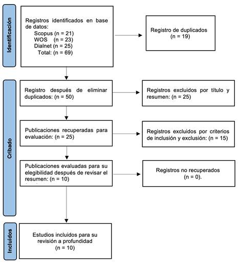 Inicialmente se encontraron 69 artículos de varias bases de datos ( figura 1) de los cuales, tras eliminar el registro de duplicados (19), se aplicaron los criterios de exclusión y lectura de loa resúmenes restantes, quedando 25. Finalmente, luego de la evaluación, se seleccionaron 10 estudios que cumplían con el propósito de la revisión sistemática plasmado en el objetivo y la pregunta de investigación. La selección se llevó a cabo mediante una tabla de registro en Excel, donde se organizaron y catalogaron las publicaciones para facilitar la lectura crítica y posterior análisis.