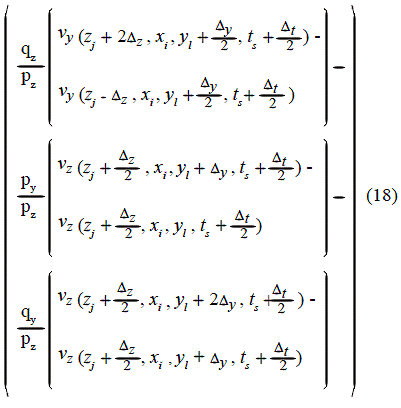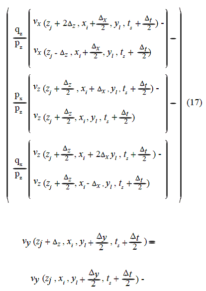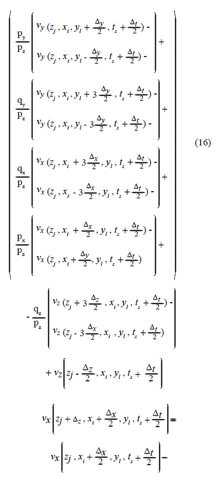 The discretization of equations (12) to (14) leads to equations (16) to (18). In these equations, Δt is the grid step in time; Δz , Δx , Δy are the grid steps for the z-axis, x-axis and y-axis respectively: ts = sΔt , zj = jΔx , yl = lΔy; zj is the interface position in the grid (aligned with the grid); pz, px , py , qz , qx , qy are the coefficients of the fourth-order approximation terms (for example