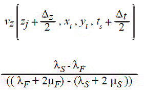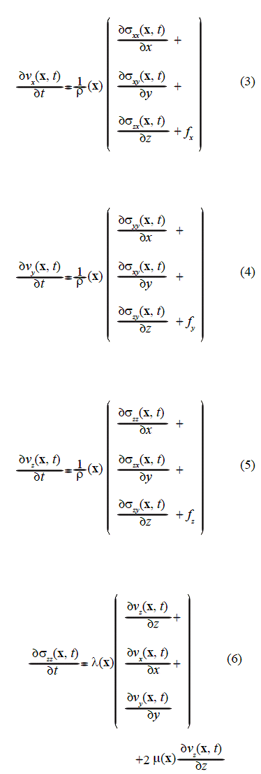 L2 (Ω) is the space of square integrable functions in Ω. We want to solve the nine equations which were used by Minkoff (2002) to describe the 3-D wave propagation model in volume V described above. These equations show the dependency between stresses, velocities, density values and Lamé parameters (Minkoff, 2002). In this work, from the different kind of sources that are possible according to the mathematical equations proposed by Minkoff, we consider an explosive source. If x is a vector of three coordinates in the Euclidian space; t a temporal variable; r. the medium density;λ and µ the Lamé Parameters; fz , fx, fy the source components; vx , vy , vz the velocities values; σzz , σxx , σyy the normal stresses; σzx , σzy , σxy the shear stresses; and α and β the compressional and the shear velocity, respectively, given by α =