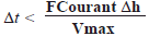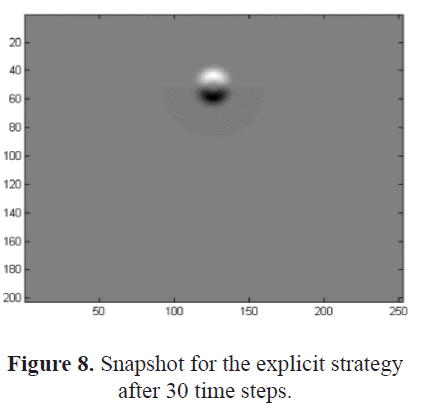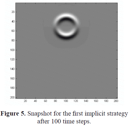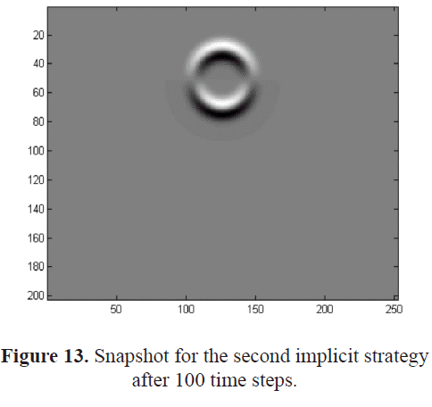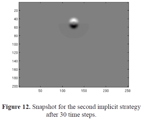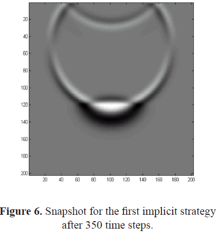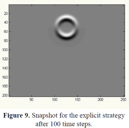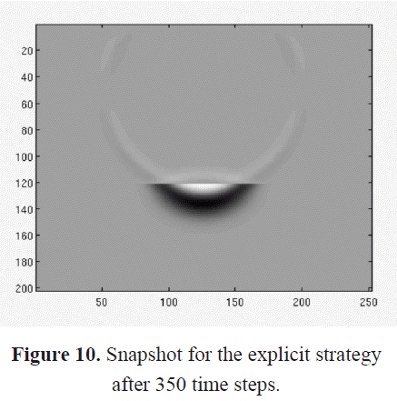, where: Δh is the grid space along the three axes, is the higher velocity value of the model and FCourant is the Courant stability factor. The time steps were taken in msec. The distance between the grid points, Δh, along the three axes is 0.035 m. The interface was located at z=120Δh. The source was positioned at z=50Δh, x=100Δh and y=100Δh for the first implicit strategy and for the other two just x was changed to 125 Δh, as the grid points changed as it is explained below.