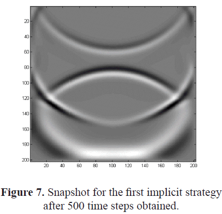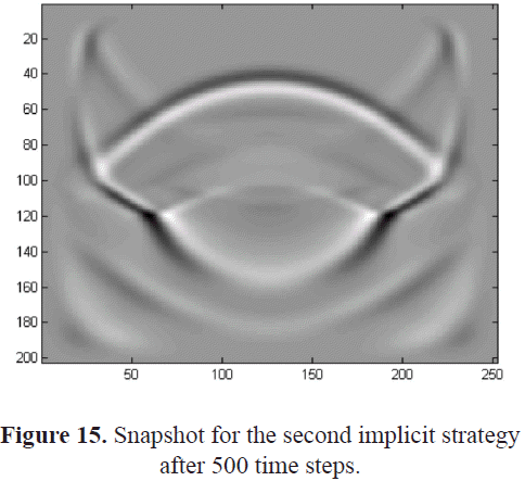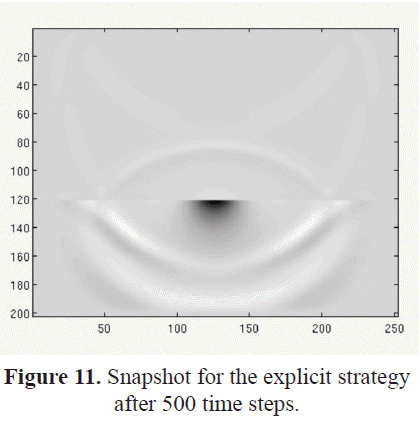 This code was executed under identical conditions for the three strategies. In that sense, we have fixed the total number of iterations. We used 500 time steps as the total number of iterations for each execution. The interface was aligned with the 3D horizontal grid in all the cases. The output is a slice of the current 3D space normal-stress solution (z-direction), at different time steps. Snapshots of the wave-field were taken after different time steps. Of particular interest is the behavior of the wave field around the interface.