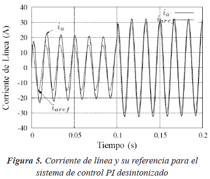 Se observa en la Figura 5 la corriente de línea y la corriente de referencia del sistema con un PI clásico desintonizado.