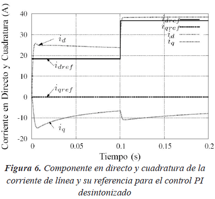 En la Figura 6 también se puede observar que la corriente id no sigue a la referencia presentando un error de estado estacionario de casi 5A y un sobrepico que sobrepasa los 5A. Por otro lado, se observa que corriente iq no sigue tampoco la referencia por lo tanto la corriente de línea en coordenadas "abc" no van a estar en fase. Se observa un sobrepico de aproximadamente 15A y un error de estado estacionario de más de 6A.