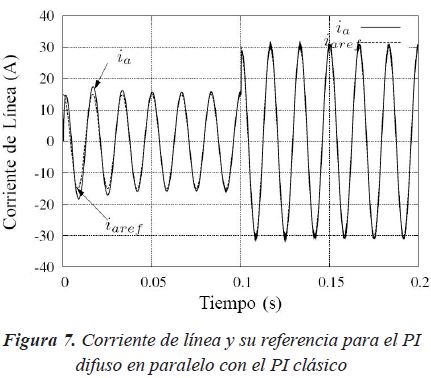 A continuación se muestran los resultados del sistema controlado con un PI difuso en paralelo con el PI clásico. En la Figura 7 se muestran la corriente de línea y la corriente de referencia.