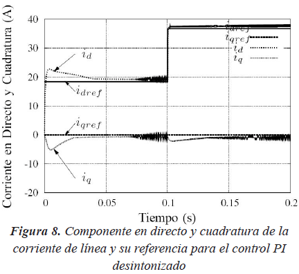 Se puede observar que la corriente sigue la referencia fielmente, sólo se tiene un pequeño sobrepico menor a 4A en la componente directa. También presenta un pequeño error en estado estacionario de 1A lo cual no es muy relevante ya que cuando se trasforma la corriente en DQ en coordenadas "abc" el error en estado estacionario es menor. El tiempo de establecimiento es menor a 0.05s.