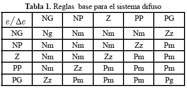 En la Tabla 1 se ha definido 5 funciones de pertenencia para cada entrada difusa. Donde las funciones de pertenencia se denominan: NG (negativo grande), NP (negativo pequeño), Z (cero), PP (positivo pequeño) y PG (positivo grande). Por otro lado, los valores de las reglas se definen por: Ng (negativo grande), Nm (negativo mediano), Zz (cero), Pm (positivo mediano) y Pg (positivo grande).