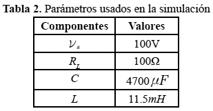 Se realiza la simulación del sistema con los parámetros dados en la Tabla 2, el valor de la inductancia fue diseñado para máxima transferencia de potencia entre la red de alimentación y el rectificador. El valor de la capacitancia se escoge entre 2000 y 5000 uF para evitar rizado elevado en el bus CC. El criterio para decidir el voltaje de la barra CC es: VCC igual a 2 veces la tensión de la barra CC cuando el rectificador no está controlado.