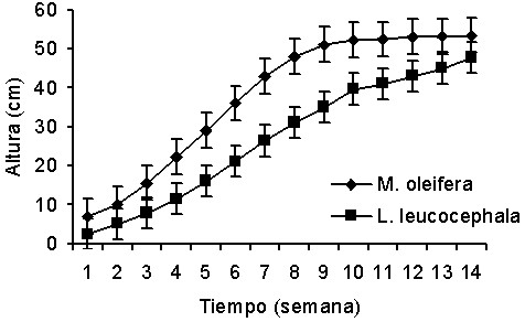 Respecto a la altura de M. oleifera y L. leucocephala, la Figura 1 muestra que ambas especies crecieron de forma progresiva durante todo el lapso del experimento. En M. oleifera a partir de la séptima semana no se observó mayor crecimiento. En el caso de L. leucocephala, los aumentos de la altura fueron continuos en cada momento de medición y los valores alcanzados mostraron diferencias altamente significativas entre sí. A partir de la décimo tercera semana de medición no se encontraron diferencias significativas entre las alturas de ambas especies; las cuales fueron de 45,00 y 53,20 cm para L. leucocephala y M. oleifera en dicha medición, respectivamente.