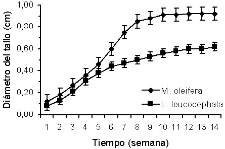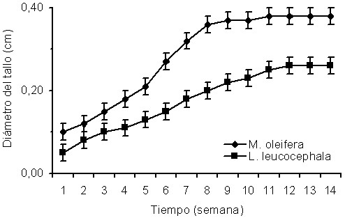 En ambas especies el diámetro de la base del tallo se incrementó con el transcurrir de las semanas, lo que evidencia que a medida que la planta madura expresa su mayor desarrollo y crecimiento. El hecho de que hasta la sexta semana en ambas especies no existieron variaciones en esta variable, demuestra que desde la emergencia las especies presentan un comportamiento similar. A partir del momento en que comienzan a diferenciarse, M. oleifera muestra resultados superiores comparado con L. Leucocephala, donde el engrosamiento del tallo fue lento, pero progresivo, tendencia similar observada por Angulo et al. (1997).