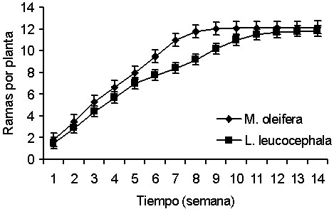 Que ambas especies manifestaran similitud en cuanto al aumento del número de ramas pudo estar dado a que, independientemente a su distante ubicación taxonómica, estas presentan una arquitectura similar en cuanto al patrón de formación y disposición de las ramas en su etapa inicial de desarrollo. En el caso de M. oleifera, la mayor cantidad de ramas encontradas entre la sexta y la novena semana, y su poca variación en el resto del tiempo, puede constituir un indicador de que haya alcanzado su total madurez en dicha etapa. Caso contrario se observó en L. leucocephala en la cual, la dinámica de este indicador fue lenta en las primeras semanas, en comparación con la primera.