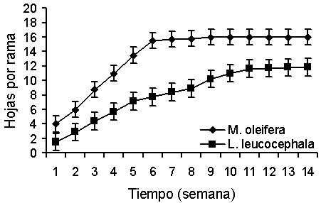 En cuanto a la cantidad de hojas por rama, la Figura 4 muestra que en M. oleifera no se encontraron aumentos significativos a partir de la semana seis. Sin embargo, en L. leucocephala, hasta la novena semana, se observaron incrementos sustanciales (P<0,05). En todas las semanas las especies mostraron diferencias estadísticas entre sí (P<0,05). En la semana catorce M. oleifera presentó más de 16 hojas por rama y L. leucocephala solamente 11.