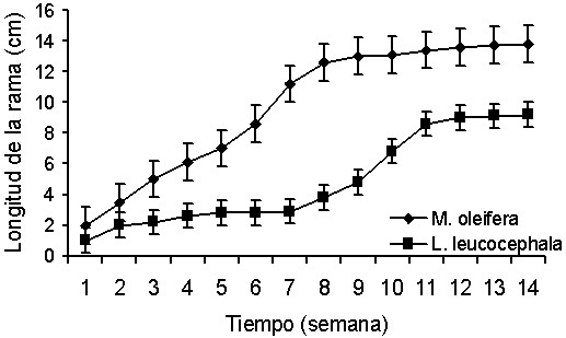 Hasta la semana siete M. oleifera mostró una elongación de las ramas altamente significativa (Figura 5). Por su parte, a partir de la oncena semana, las ramas de L. leucocephala, no mostraron incrementos sustanciales en su longitud. Después de la segunda medición, la longitud de las ramas entre las especies presentó diferencias a favor de M. oleifera. Al final de la evaluación, las ramas de M. oleifera medían 13,9 cm, mientras que las de L. leucocephala tenían una longitud de 9,4 cm.
