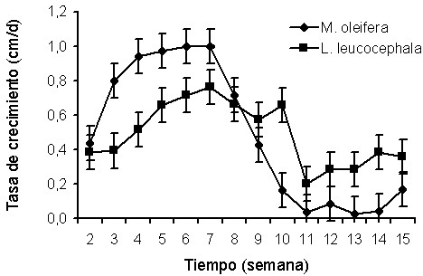Con relación a la tasa de crecimiento en función de la altura (Figura 7), se observó que en la semana siete para M. oleifera y nueve y diez para L. leucocephala se obtuvieron los mayores valores numéricos. Durante las primeras siete semanas M. oleifera exhibió un crecimiento significativamente más rápido que L. leucocephala. Sin embargo, en las semanas 8, 9, 11 y 15 no se observaron diferencias apreciables entre las especies.