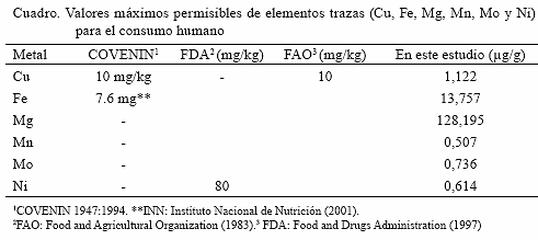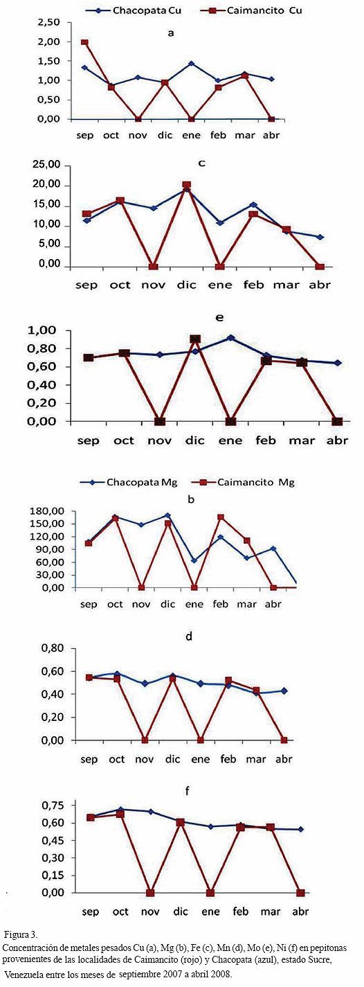 μg /g), Mn (0,642 μg /g) y Ni (0,905 μg /g), y para el Cu (1,801 μg /g), Fe (23,505 μg /g) y en Mo (1,018 μg /g) en los meses de septiembre, diciembre y enero, respectivamente. En Caimancito, las mayores concentraciones de casi todos los metales se detectaron en el mes de septiembre (Cu 1,987; Fe 18,625; Mn 0,582; Mo 0,699 Ni 0,577 μg /g) y en el mes de febrero (Mg 211,05 μg /g) (Figura 3), en tal sentido, los resultados obtenidos en el presente estudio para Cu, Fe y Ni están por debajo de los valores de referencia existentes (Cuadro); es de resaltar que las concentraciones obtenidas son bajas al compararlas con las obtenidas por Alfonso et al., (2005), quienes analizaron muestras de Tivela mactroides en diferentes localidades de las región centro-costera venezolana.Bajo este contexto Boada et al., (2007), recomiendan que al no existir normas venezolanas que establezcan los límites permitidos de algunos elementos traza es menester contribuir con dichos resultados como referencia para normas posteriores, pues en la actualidad sólo se reportan las normas COVENIN para determinación de plomo (COVENIN, 1978a), cadmio (COVENIN, 1978b) en alimentos, así como normas industriales para pepitonas en conserva (COVENIN, 1994), atún en conserva (COVENIN, 1995) y sardinas en conserva (COVENIN, 1998). Los valores de hierro registrados en el presente estudio son inferiores a los obtenidos por Yap et al., (2008) quienes observaron que las concentraciones de metales en los tejidos blandos del Argopecten granosa variaron desde 0.80-16.15 μ