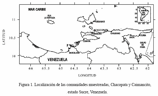 Arca zebra en las poblaciones Caimancito y Chacopata, al norte del estado Sucre, dichas localidades son zonas de gran actividad extractiva de moluscos bivalvos en Venezuela, pues de los bancos localizados en sus cercanías proviene aproximadamente, el 97% de la pepitona que se consume en Venezuela (Arias et al., 2002), discutir sobre las probables fuentes antropogénicas y naturales de los resultados obtenidos, y de algún modo sentar un precedente sobre el nivel de riesgo del consumo de este molusco por contaminación con metales pesados, con base a normas sanitarias internacionales en otros moluscos bivalvos de consumo.MATERIALES Y MÉTODOS