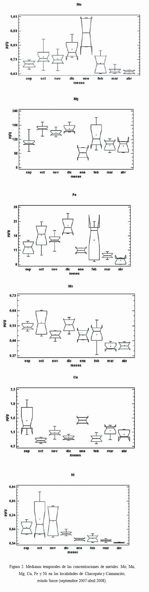 a posteriori. Sin embargo, los datos parecen indicar que la concentración máxima se registra en los meses de febrero a abril y junio, con niveles intermedios en enero y mayo, y las mínimas concentraciones en julio y agosto.Las concentraciones de cada metal en los organismos provenientes de ambas localidades presentaron discrepancias. En Chacopata, las concentraciones más elevadas se observaron en el mes de octubre para Mg (193,200
