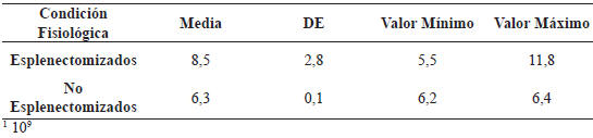 La valoración de la media del número total de leucocitos (NTL) de los animales esplenectomizados y no esplenectomizados son mostrados en el Cuadro 1, donde se evidencia que los promedios obtenidos durante el ensayo experimental, oscilaron dentro de las cifras referenciales citadas para la especie (Cotter, 2001). Es notorio que en los animales controles, el promedio (6,3 x 109) del NTL se ubicó ligeramente por debajo del rango medio de referencia (8 x 109). Los becerros esplenectomizados no revelaron fluctuaciones indicativas de alteración en la cantidad del NTL (Cuadro 1), dado que sus valores mínimos y máximos se movieron dentro los límites inferiores y superiores de referencia. La comparación de las medias entre los grupos, no indicó diferencia significativa (Cuadro 1).