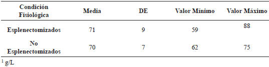 Cuadro 2. Promedios de las Proteínas Séricas Totales (PST, gramos por litro1) en los becerros esplenectomizados y sus controles.