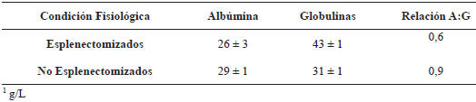 Los hallazgos obtenidos en esta investigación, no permiten expresar conclusiones defi nitivas sobre las variables estudiadas. La comparación de las medias del NTL, PST, Albúmina y Globulinas no señaló diferencias estadísticas; no obstante se pudo observar en el grupo experimental esplenectomizado que la fracción de la globulinas aumentó ligeramente, lo cual podría sugerir producción de anticuerpos, situación que se refl eja en el cociente A:G. Se recomienda profundizar este tipo de estudios, incluyendo la evaluación de otras variables y sus fracciones para confi rmar o negar las observaciones aquí referidas.