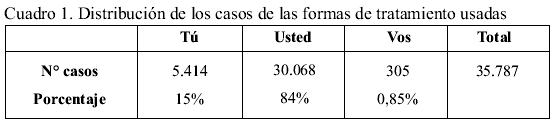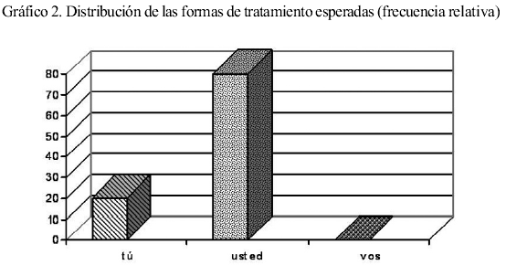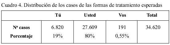 De estos resultados importa destacar que el pronombre vos sigue siendo el tratamiento menos deseado, y que incluso merma frente al uso, que ya era marcadamente exiguo: como forma deseada apenas alcanza el 0,55% de la distribución, lo cual supone un descenso de 30 décimas en relación con la proporción de uso, que por otra parte, fue apenas de 0,85%. Tal y como se observa en el cuadro 4, la opción vos ha sido escogida como tratamiento deseado 191 veces de un total de 34.620 casos, en comparación con usted, que aparece 27.609 veces (80%) y tú, en 6.820 ocasiones (19%).