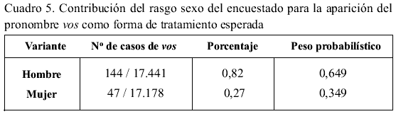 Para el análisis probabilístico se ha empleado el programaGoldvarb 2001 (Lawrence, Robinson y Tagliamonte 2001), que ha sido diseñado específicamente para la investigación sociolingüística variacionista.4 Apesar de que los factores escogidos como impulsores del voseo han sido ocho, a los fines de esta exposición sólo interesa destacar que la primera posición en la jerarquía que ha establecido el análisis probabilístico está ocupada por el sexo del encuestado.5 Favorece la elección del pronombre vos el hecho de que el hablante sea hombre y la restringe su condición demujer. El peso probabilístico asignado al factor hombre duplica, en efecto, al que presenta el rasgomujer. Por otra parte, las frecuencias de vos entre los varones multiplican en más de cuatro la cifra de uso de las mujeres (ver cuadro 2). Todos estos detalles, sumados a la circunstancia de que el sexo del encuestado ocupa, como se ha dicho, la primera posición entre los factores escogidos por Goldvarb 2001 como contribuyentes para la aparición de la forma en estudio, apuntalan la presunción de que el voseo sea marca de identidad de género masculino. No hay que olvidar que, en efecto,