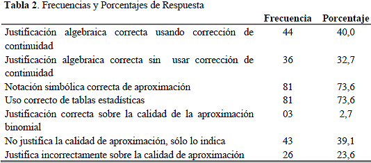 a) Algunos estudiantes llegaron a un enunciado intuitivo del teorema central del límite, para este caso particular; otros han usado sus conocimientos previos de estadística descriptiva sobre simetría y sus propiedades; también, utilizan la regla empírica sobre condiciones para la bondad de ajuste; realizan cálculos de probabilidades teórica y aproximada lo que implica su estandarización a la distribución normal. En general, los alumnos llegan a utilizar las propiedades, aunque se han presentado dos concepciones erradas. La primera consiste en tener sólo en cuenta el tamaño de muestra adecuada, sugiriendo una buena aproximación si