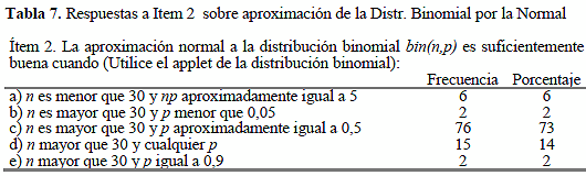 Finalmente, se aplicó al término del semestre académico un Cuestionario a los estudiantes de ingeniería, de los cuales se presentan los resultados de tres ítems relacionados con la aproximación de la distribución binomial por la normal (Tablas 6, Tabla 7, Tabla 8). En el ítem 2 respondieron 101 alumnos de los 104 que completaron el mismo. Las respuestas correctas están denotadas en negrita.