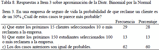 p y condición que np = nq = 15 > 5. De los distractores, menos de la cuarta parte del grupo utilizó el razonamiento de transición considerando sólo una muestra suficientemente grande para la bondad del ajuste de aproximación (d), y un porcentaje menor razonó equivocadamente en un nivel cuantitativo (b y e) al considerar dos aspectos, un tamaño de muestra grande pero np o nq no cumplen la condición.En el ítem 3, sólo un 28% de estudiantes acertó en considerar más probable el caso de muestra más pequeña como la de
