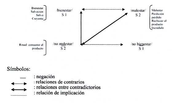 Para pasar de la condición /malestar/ a /bienestar/ debe primero pasarse por la negación /no malestar/. Esta condición /no malestar/ se manifiesta en consumir el producto que implica un ritual de salvación. El producto se convierte en elemento imprescindible del ritual, no sólo por la reiteración sino por su carácter soteriológico.