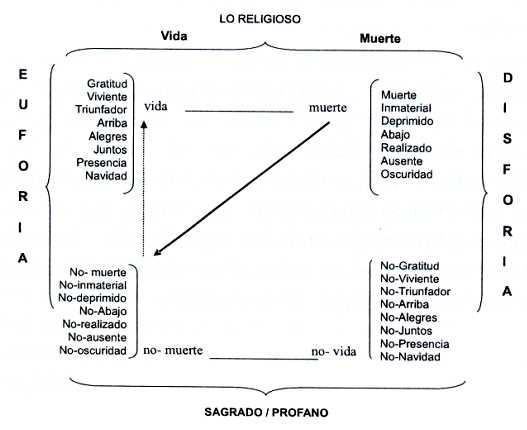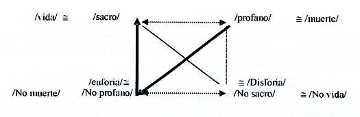 En la isotopía religiosa se encuentran los semas /sacro/profano. Ambos constituyen los términos opuestos del eje sémico. El cuadrado semiótico puede ser establecido con estos términos /sacro/ y /profano/. La categoría sémica puesta en marcha por dichos términos es la de /RELIGIOSIDAD/. Por otro lado, se encuentra el sema nuclear /euforia/ que ha sido expresado como el sema /vida/ para expresarlo abreviadamente. Es indudable que el término contrario, en el eje sémico correspondiente, es /disforia/ expresado como /muerte/. En todo caso, el juego semiótico de las oposiciones permite generar dicho sema en la dinámica interna de todo el discurso.