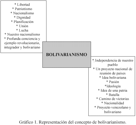 En el análisis de la muestra se constata también la construcción que el líder hace del concepto de bolivarianismo, revalorizando el significado del término a través de todos los discursos de la muestra. Se ubican en los documentos revisados referencias que permiten reconstruir este concepto a partir de las asociaciones léxicas encontradas.