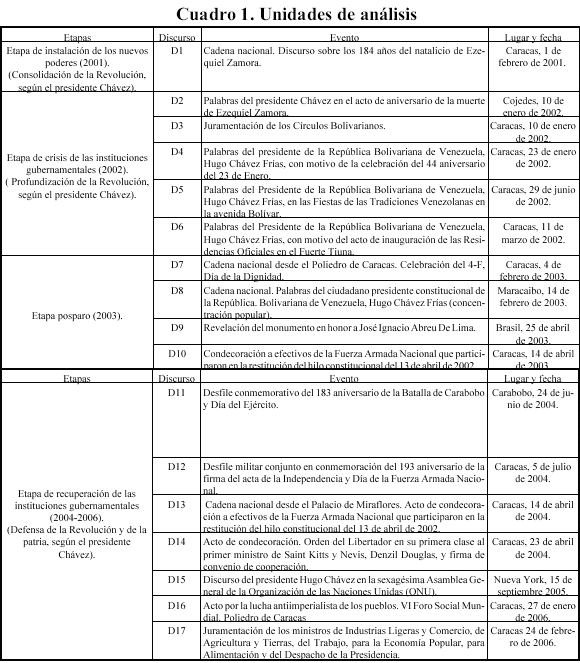 La muestra seleccionada ha sido organizada de acuerdo con las diferentes etapas por las cuales ha pasado el mandato del presidente Hugo Chávez Frías (HCF). Para ello se han tomado en cuenta las circunstancias y variables presentadas en los diferentes discursos del líder político. De esta forma, en el cuadro 1 se ubican los discursos del Presidente en las diferentes etapas por las cuales ha pasado su gobierno. Es necesario aclarar que en todas las fases se identifica el tema de la revolución como la acción principal que impulsará los cambios positivos que se van a suceder en el país.