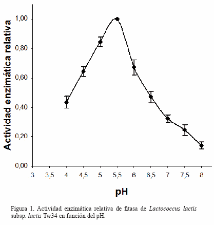 Determinación de la actividad enzimática: La cepa de Lc. lactis subsp. lactis Tw34 se cultivó durante 18 h a 30 ºC en caldo MRS. Luego del período de incubación el cultivo se centrifugó a 5.000 g durante 5 min. Las células se resuspendieron en agua destilada y se sometieron a un tratamiento con cuentas de vidrio y vortex durante 10 min con el objeto de liberar su contenido citoplasmático. Luego de este tratamiento se centrifugaron los extractos celulares a 5.000 g durante 5 min y se determinó la actividad enzimática del sobrenadante. La reacción se llevó a cabo con 100 μL de sobrenadante y 900 μL de una mezcla de reacción que contenía 10 mg/mL de fitato de sodio (Sigma) en buffer acetato 0,1 M, pH 5,5 [23]. La reacción se realizó a 35 ºC durante 30 min y se detuvo agregando 1 mL de ácido tricloroacético al 10%. Luego de la reacción, el fosfato liberado se determinó utilizando 100 μL de muestra y 900 μL de una solución que contenía 0,6 M de H2SO4, 2% de ácido ascórbico y 0,5% de molibdato de amonio. La reacción se llevó a cabo a 50 ºC durante 30 min y luego se realizó la lectura de la densidad óptica a 820 nm [24]. Para la curva de calibración se utilizó una solución patrón de K2HPO4.