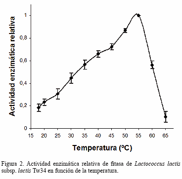 La fitasa mostró actividad en todo el espectro de temperatura estudiado (18-65 ºC). A 55 ºC se obtuvo la máxima actividad enzimática (Figura 2), por encima de la cual se observó una disminución drástica.