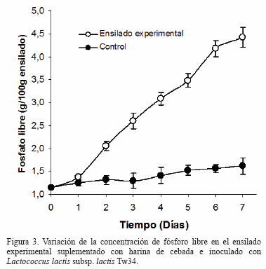Bajo las condiciones experimentales logradas durante la fermentación con la cepa Lc. lactis subsp. lactis Tw34 del ensilado suplementado con harina de cebada (18 ºC, pH 4,4) se logró un aumento constante de la concentración de fosfatos libres a partir del segundo día de incubación, alcanzando al final de la experiencia un valor aproximadamente 4 veces mayor al inicial. En cambio, este parámetro no varió en forma significativa en la muestra control; el pequeño aumento observado se debe a la liberación espontánea de fosfatos a partir de acido fítico [25] y a la acción de la fitasa del cereal que bajo las condiciones de la experiencia no exhibe una actividad apreciable [6,17].