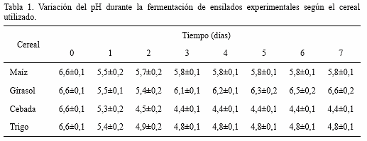 Variación del pH en el ensilado experimental en función del cereal utilizado: En la tabla 1 se pueden observar las variaciones de pH en los ensilados experimentales según el cereal utilizado durante la fermentación. Luego de 24 h el pH en las 4 experiencias descendió hasta aproximadamente 5,5. Sin embargo, luego de 2 días de incubación, el pH del alimento suplementado con harina de maíz aumentó hasta llegar a valores estables de 5,8 hasta los 7 días de incubación. En el caso del girasol se observó un fenómeno comparable, pero el pH continuó en ascenso hasta el final de la experiencia alcanzando valores de 6,6. El pH del alimento suplementado con harina de trigo descendió hasta estabilizarse luego de 2 días de incubación en un valor de 4,8; mientras que en el caso de la cebada los valores se estabilizaron en igual período en 4,4.