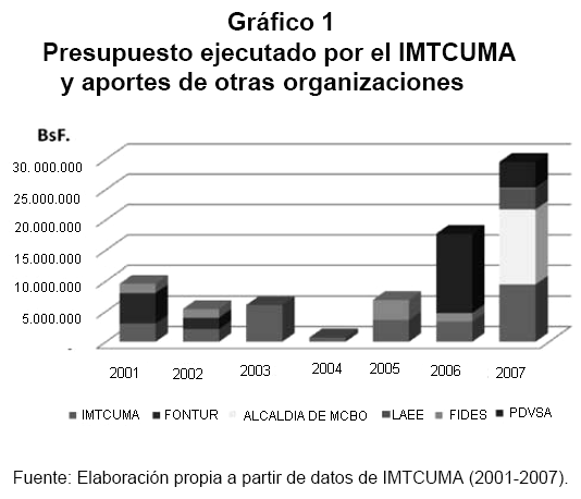La ejecución del presupuesto por aportes propios es limitada. Según entrevistas realizadas a los funcionarios del IMTCUMA, solo se dispone de los aportes que le asigna la Alcaldía de Maracaibo, ya que en este organismo sus ingresos propios son escasos. Esto restringe la gestión de la institución, la implementación de los programas se ven afectados por la falta de recursos, de allí la importancia del apoyo financiero del gobierno nacional.