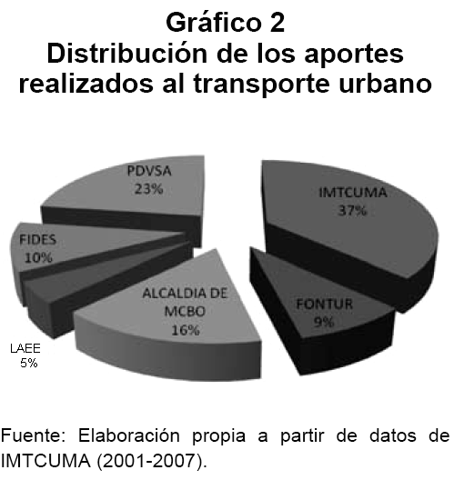 En los años 2003 y 2004 solo hubo aportes propios en transporte en el Municipio Maracaibo, y todo se invirtió en el programa de repavimentación vial, para, finalmente, inaugurar (en el 2004) tres corredores viales ubicados en zonas periféricas de la ciudad. La distribución de los aportes realizados a la gestión del transporte urbano en el Municipio Maracaibo se muestra en el Gráfico 2. Como puede observarse, del total correspondiente a inversiones, el IMTCUMA sólo aportó el 37% (28,260 millones de bolívares); seguido por PDVSA con un 23% y (Bs. 17,240 millones); la Alcaldía de Maracaibo el 16% (12,263 millones); FIDES con 10% (Bs. 7,786 millones); FONTUR con 9% (6,904 millones) y LAEE con 5% (Bs. 3,447 millones) para un total de Bs. 75,898 millones durante el período 2001 - 2007.