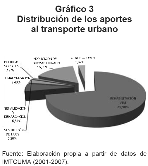 A través de la ejecución del presupuesto propio y con los aportes realizados por los organismos antes mencionados, se constató que el IMTCUMA ejecutó acciones en otros ámbitos del transporte urbano, distintos a los originalmente establecidos. En el Gráfico 3, se muestra como se llevó a cabo la distribución de los recursos en transporte urbano. El programa de rehabilitación vial fue la que recibió mayor inversión (72%), seguida de la adquisición de unidades (16%), demarcación y señalización, otros aportes8, semaforización, políticas sociales, y, sustitución de taxis.