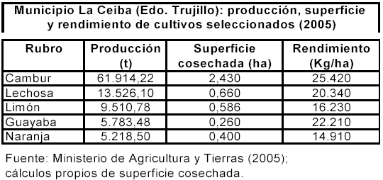 Sobre la base de las cifras aportadas por el MAT y CORPOANDES y la visita realizada a la zona, pareciera que el Municipio La Ceiba se ubica en la primera categoría antes señalada. Esto obedece al hecho de que, aún cuando dispone de excelentes condiciones para el desarrollo agroalimentario, existe la necesidad de crear el entorno social-económico e institucional favorable para la transformación progresiva de los sistemas productivos y la consolidación del tejido empresarial del sector frutícola, a fin de potenciar las ventajas competitivas de que dispone esta región en el sector mencionado y de promover su inserción eficiente en los mercados globalizados.